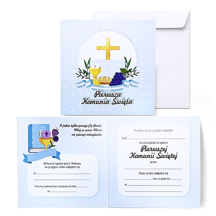Zaproszenie Komunijne - Pierwsza Komunia Święta, wykonane z niepowlekanego, bezdrzewnego papieru klasy premium o z wysokim współczynnikiem białości zapewniający doskonałe krycie i kontrast dla tekstów i grafiki.