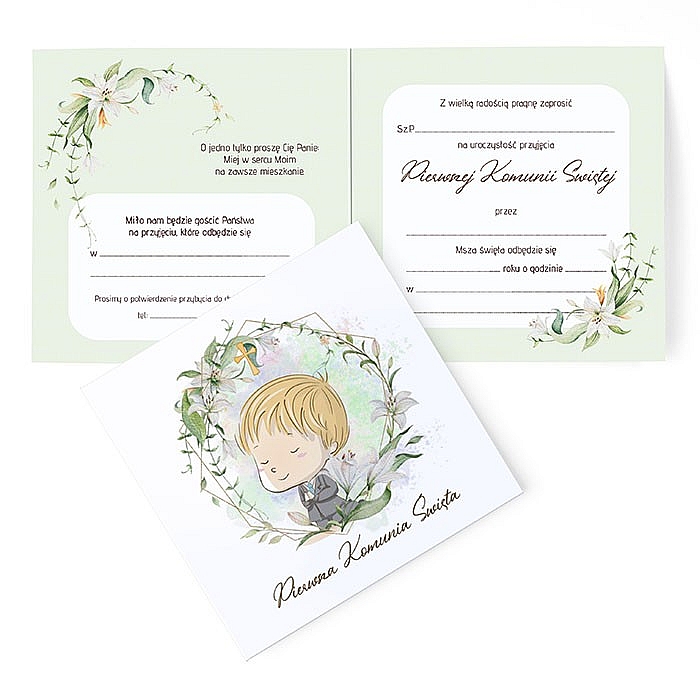 Zaproszenie Komunijne - Na pierwszą Komunie Świętą dla chłopca, wykonane z niepowlekanego, bezdrzewnego papieru klasy premium o z wysokim współczynnikiem białości zapewniający doskonałe krycie i kontrast dla tekstów i grafiki.