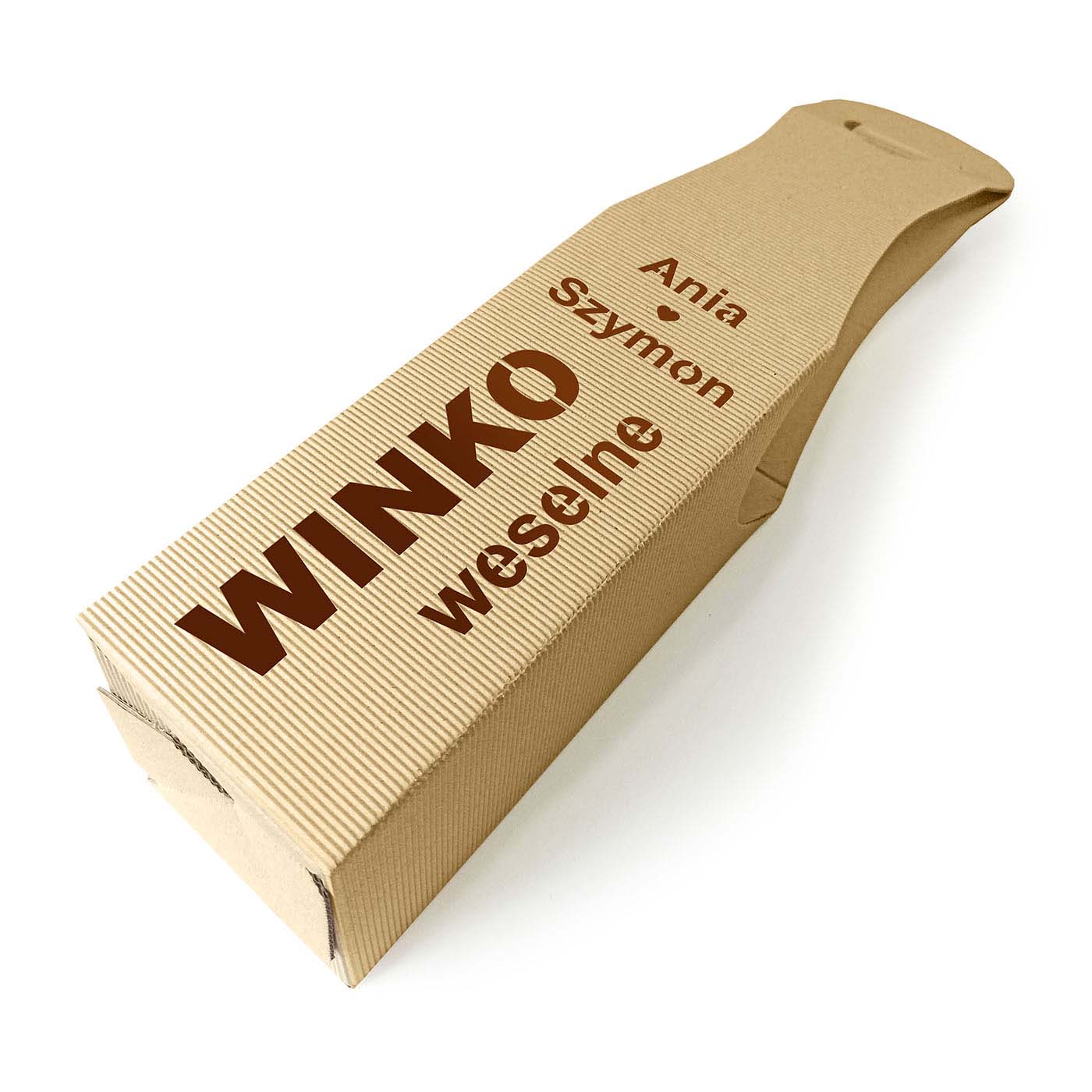 Ekologiczne opakowanie na alkohol weselny wykonane z ozdobnej tektury falistej z wyciętym laserowo napisem oraz imionami Młodej Pary