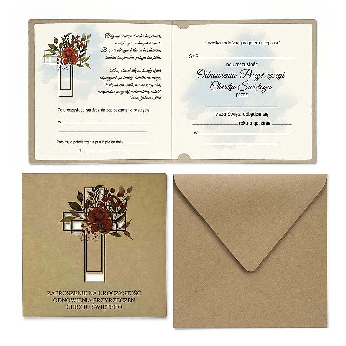 To zaproszenie łączy w sobie klasykę, ekologię i subtelną elegancję, będąc idealnym wyborem dla rodzin, które chcą podkreślić wyjątkowość uroczystości Odnowienia Przyrzeczeń Chrztu Świętego, jednocześnie pozostając w harmonii z naturą.
