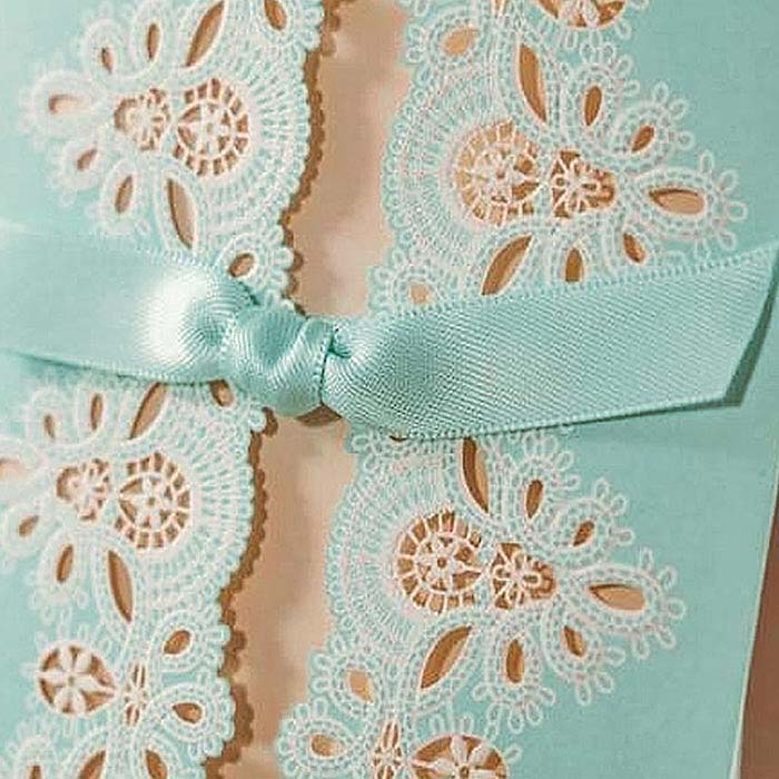 Okładka wykonana z wysokiej jakości, sztywnego papieru barwionego w masie, w odcieniu eleganckiego turkusu. Efektowne ażurowe wycięcia tworzą misterny, koronkowy wzór, przez który prześwituje wkładka. Całość wieńczy ręcznie wiązana, pastelowa kokarda z błękitnej satynowej wstążki - subtelny akcent, który dodaje lekkości i klasy.