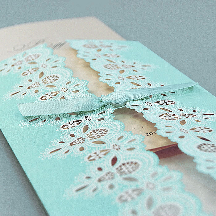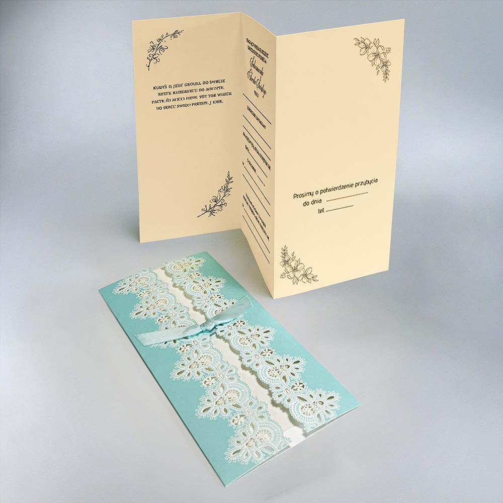 Subtelne, eleganckie zaproszenie na Chrzest Święty, idealne dla tych, którzy cenią sobie klasykę i kunsztowne wykończenie. Okładka wykonana z turkusowego papieru ozdobnego zachwyca misternym, laserowo wycinanym wzorem przypominającym koronkę, który pięknie eksponuje kremowe tło wkładki. Całość dopełnia delikatna satynowa wstążka zawiązana w uroczą kokardkę.