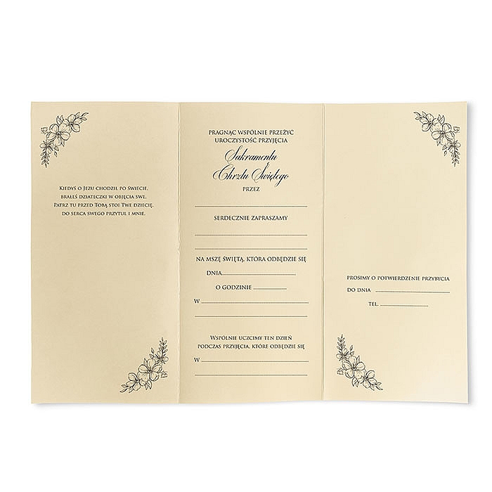 W środku znajduje się gotowy, elegancki tekst do własnoręcznego wypisania danych uroczystości - rozwiązanie wygodne, a jednocześnie pozwalające zachować osobisty charakter zaproszenia.