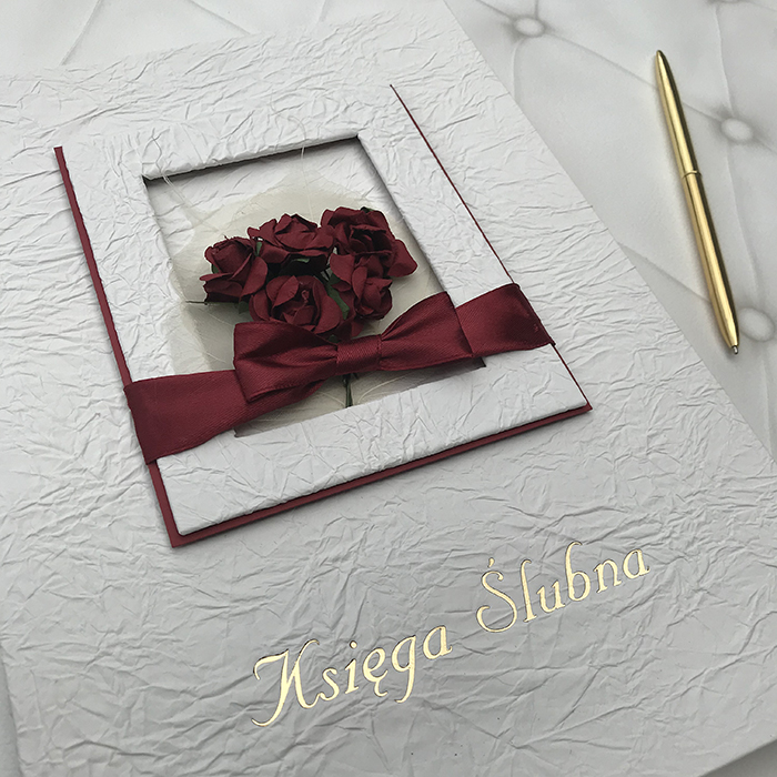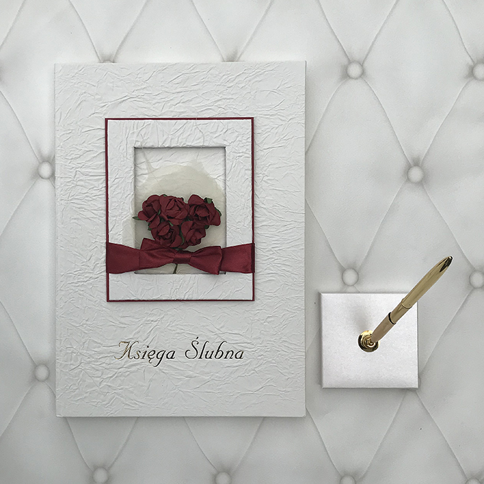 Księga wpisów wykonana ręcznie z papieru czerpanego w kolorze ecru. Okładkę zdobi romantyczna czerwona wstążka oraz wtapiane róże. Miejsce na Państwa inicjały lub ślubne zdjęcie czyni ten album spersonalizowanym dodatkiem do całej uroczystości. W księdze znajduje się miejsce na pamiątkowe wpisy Państwa bliskich. Element uroczystości zapamiętany na lata...
