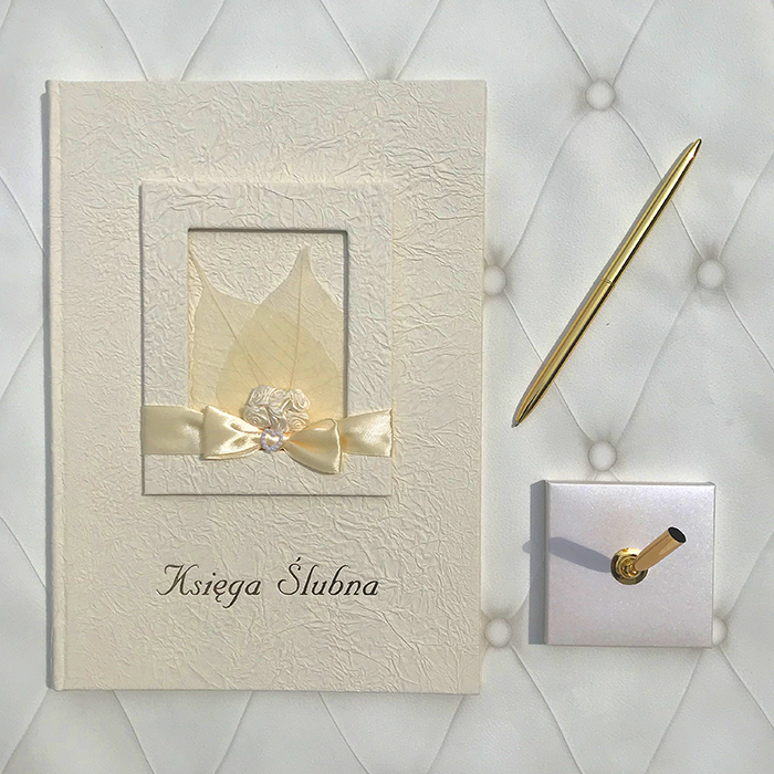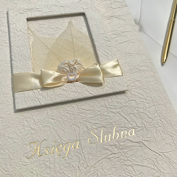 Księga gości wykonana ręcznie z papieru czerpanego w kolorze ecru. Całość zdobią wtapiane, herbaciane róże oraz wstążka ze starannie wykonaną klamrą. To specjalne miejsce na pamiątkowe wpisy Państwa bliskich. Różnica tkwi w szczegółach, które czynią uroczystość wyjątkową...
